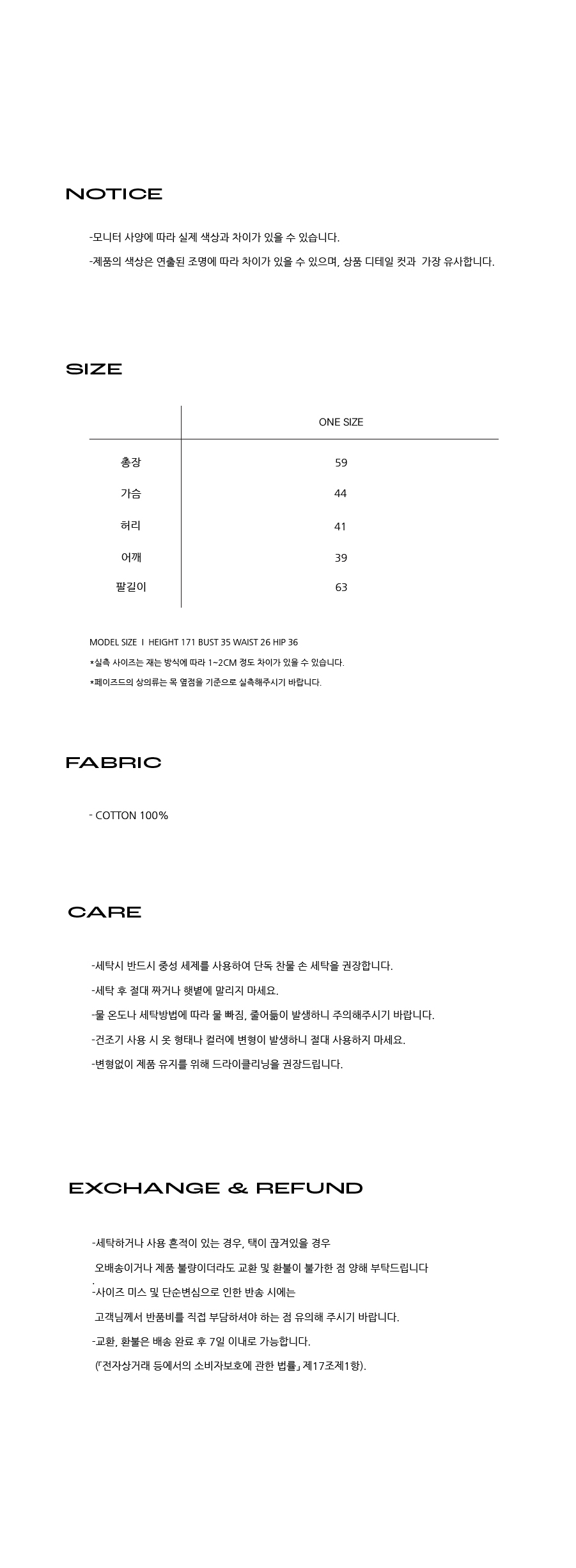 - 수령일로부터 7일이내 c/s 문의글로 신청(문의글 이외 및 해당 기간 이후 신청 시 교환 및 환불불가)가능하며 택달린 새상품의 경우에만 가능합니다.