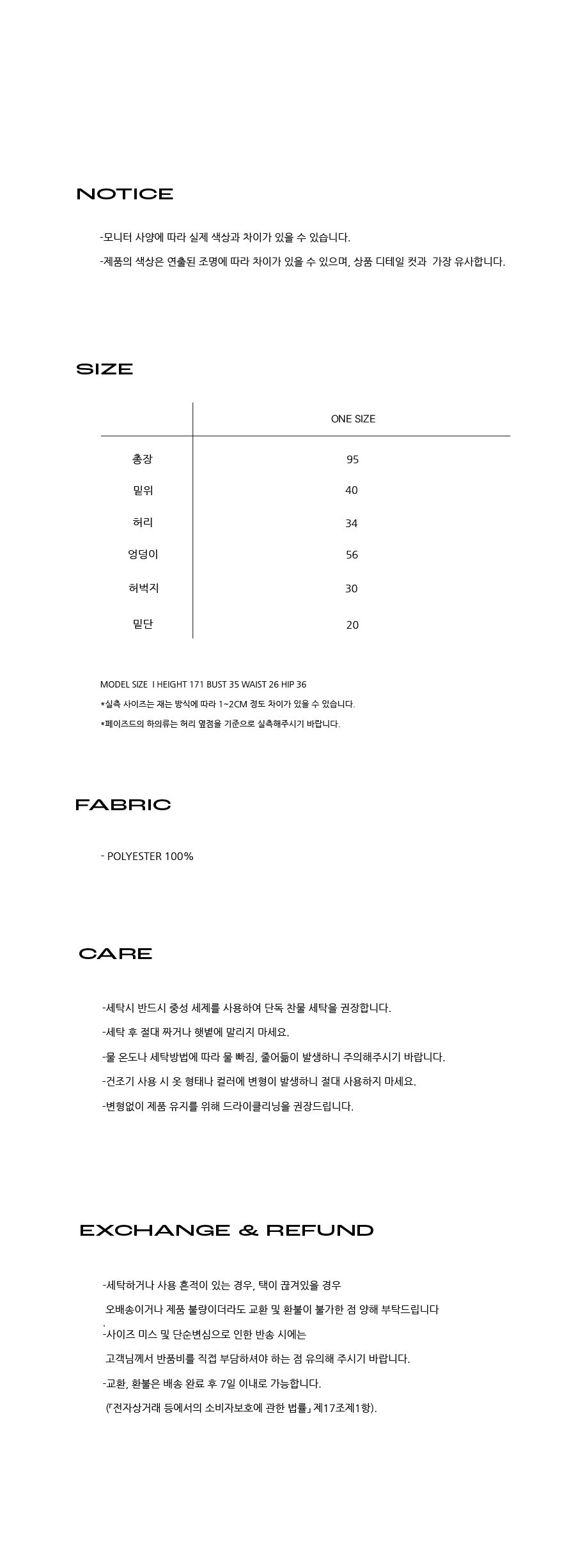 - 수령일로부터 7일이내 c/s 문의글로 신청(문의글 이외 및 해당 기간 이후 신청 시 교환 및 환불불가)가능하며 택달린 새상품의 경우에만 가능합니다.
