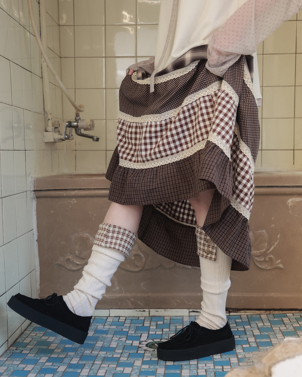 - 체크 원단이 폴딩된 디자인의 니삭스